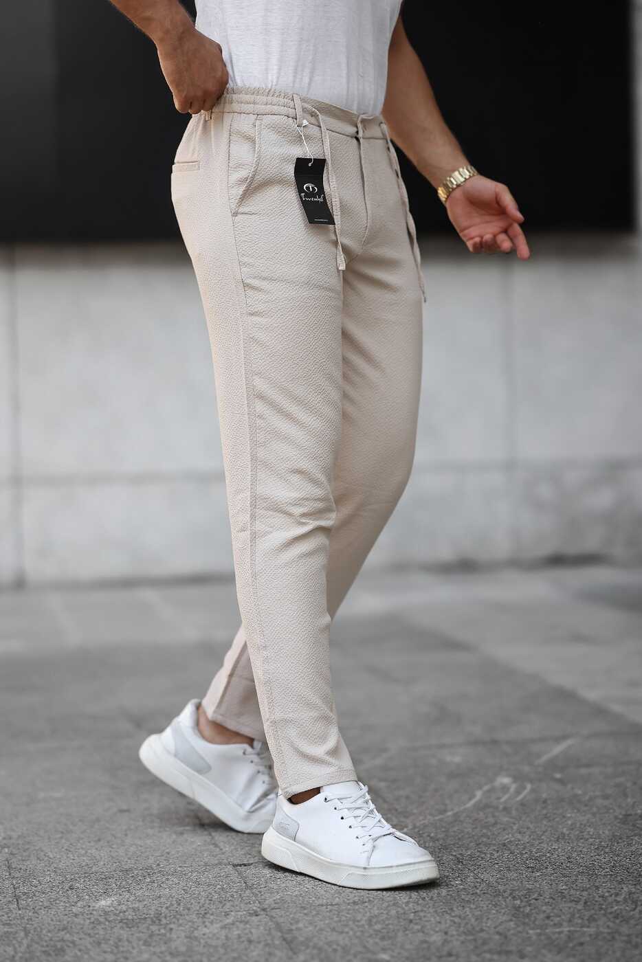 Regular Beli Bağcıklı Pantolon Krem